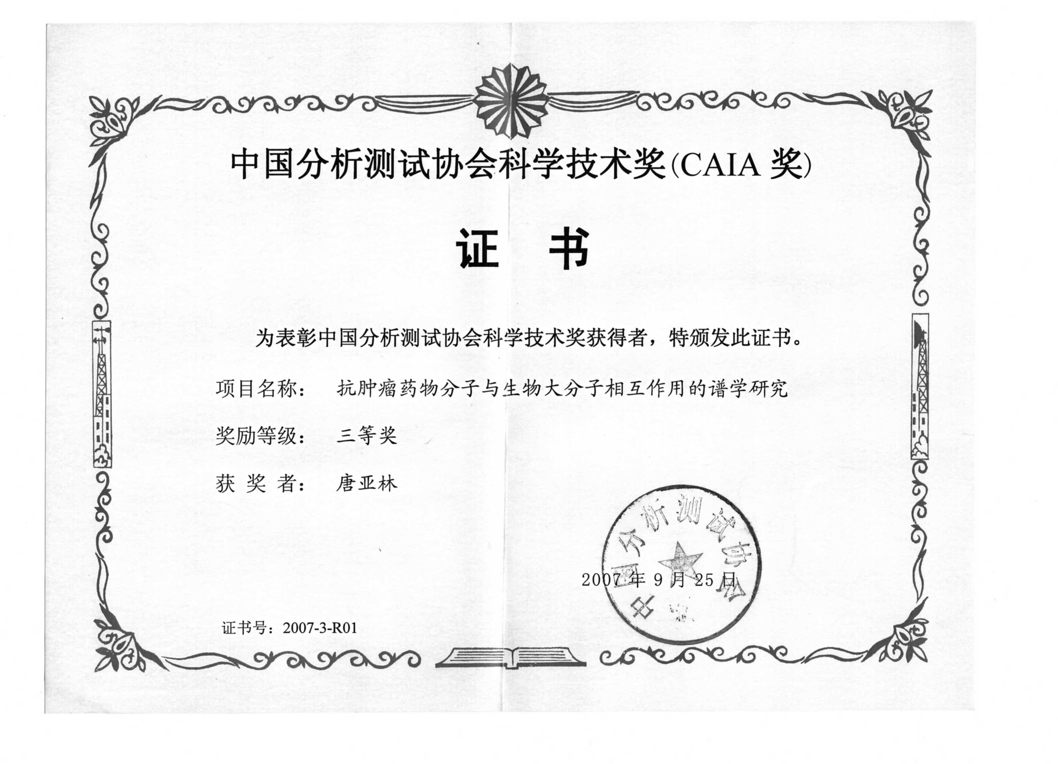 奖项:2007年度中国分析测试协会CAIA奖三等奖