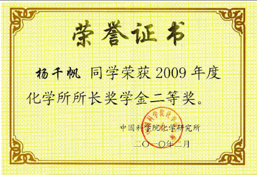 奖项:2009年化学所“所长奖学金”三等奖