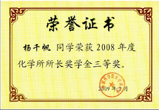 奖项:2008年化学所所长奖学金一等奖